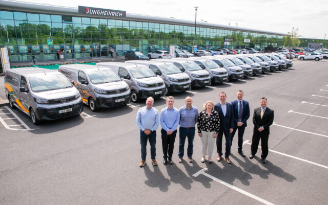 Jungheinrich Lift Truck Ltd, the Irish subsidiary of Jungheinrich AG Hamburg, has significantly invested in a new green initiative and taken delivery of a fleet of zero emissions Opel Vivaro Electric light commercial vehicles, illustrating the company’s firm commitment to reducing its transport emissions and environmental impact. The leading material handling solutions provider recently took delivery of the fourteen vehicles from Opel Ireland, attended by representatives from PTSB and Hertz Lease, at the company’s headquarters in Maynooth, County Kildare.